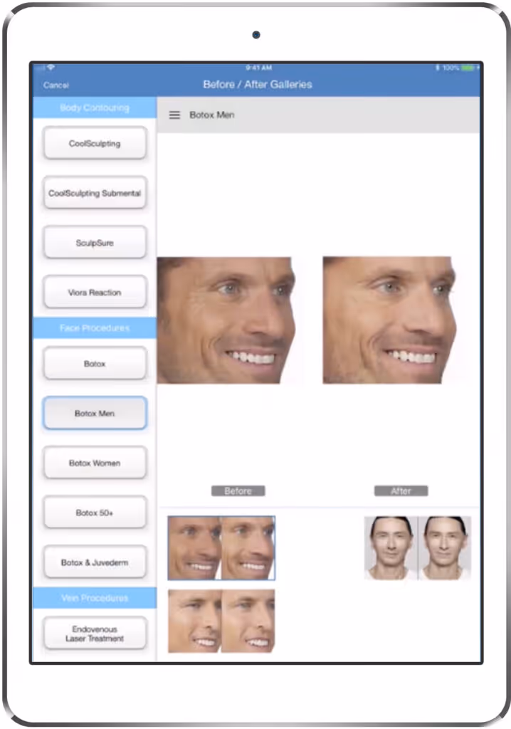 Aesthetic technicians are not necessarily skilled salespeople, but with high-quality before and after galleries, they don’t have to be. Most clinics have before and after galleries available online. However, not all clinics have systematic, easy-to-share galleries to show patients in-house. This is a major miss in educating clients. Says Warren Danforth, owner of Spa 35 Med Spa:
